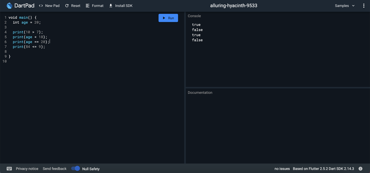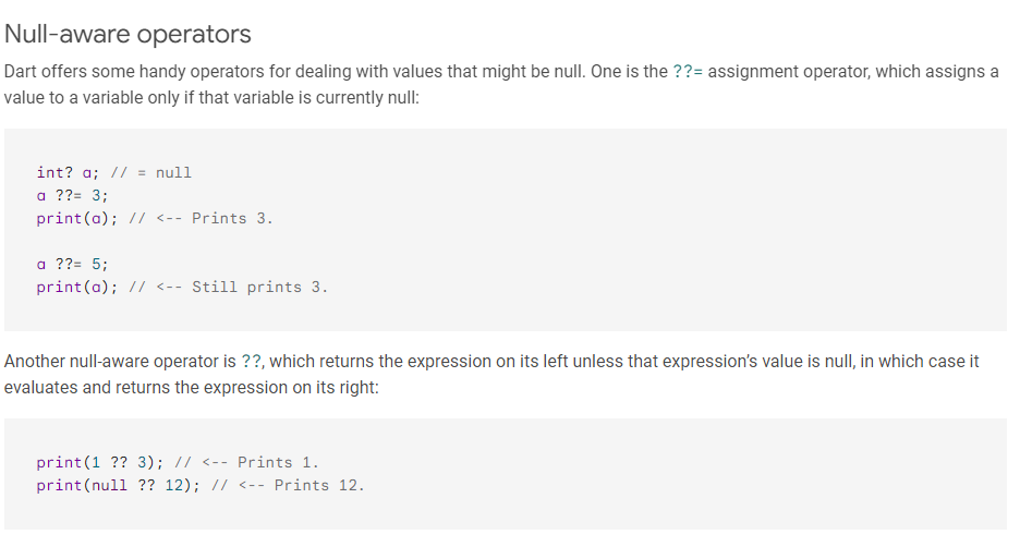 그리고 Dart를 학습하다 많은 사람들이 어려움을 겪는 NullSafety와 관련해서도 몇몇 연산자들이 존재한다. 이부분은 여기서 눈도장만 찍어두고, 추후 NullSafety를 설명한 이후 설명하도록 하겠다.
