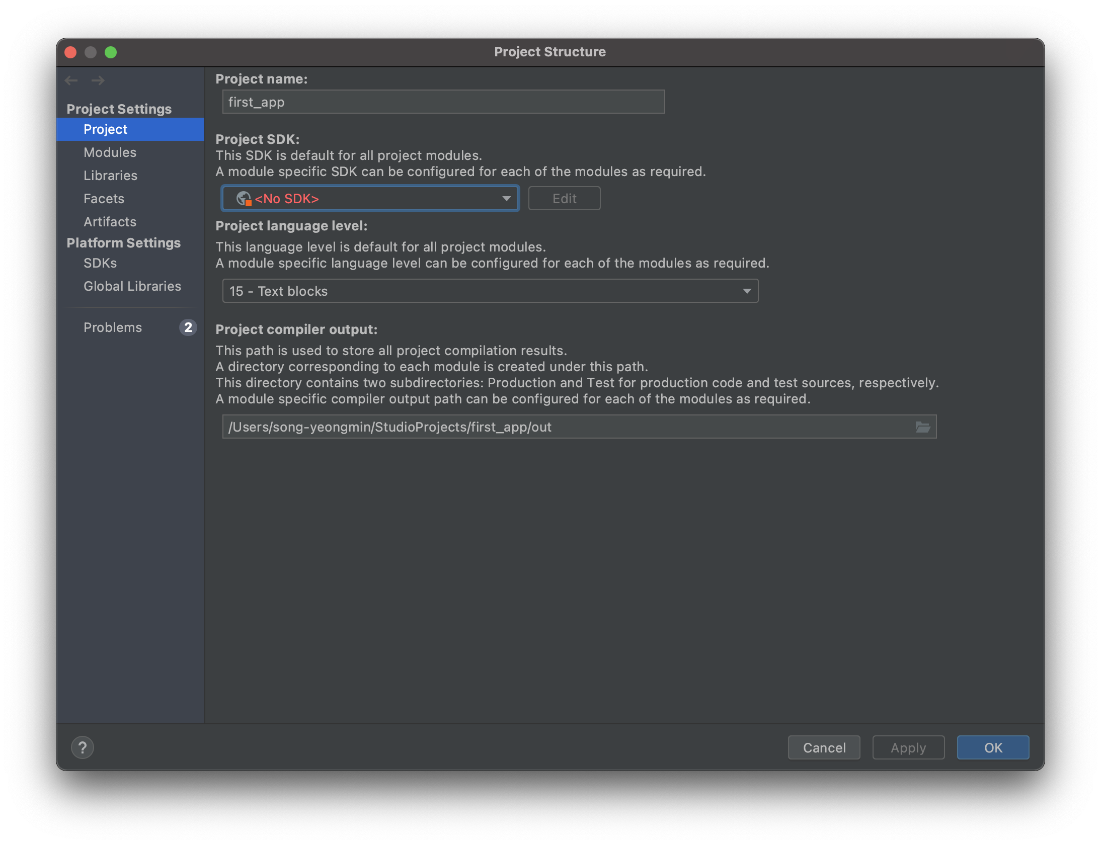 File -> Project Structure -> Project Settings 에서 저 No SDK 설정을 바꿔주면 된다.